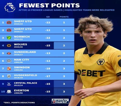 狼队10轮2分英超历史同期第4差,榜单中前8球队7支最终都降级