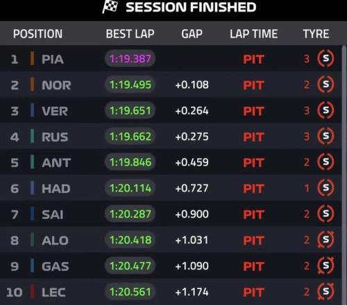 来到杆位争夺,诺里斯一上来就刷出1:19.495,皮亚斯特里落后0.035秒紧随其后。维斯塔潘第一圈没有跑好,不过第二圈也落后0.454秒,拉塞尔夹在第三的位置。勒克莱尔则是给大家表演了一个打滑……