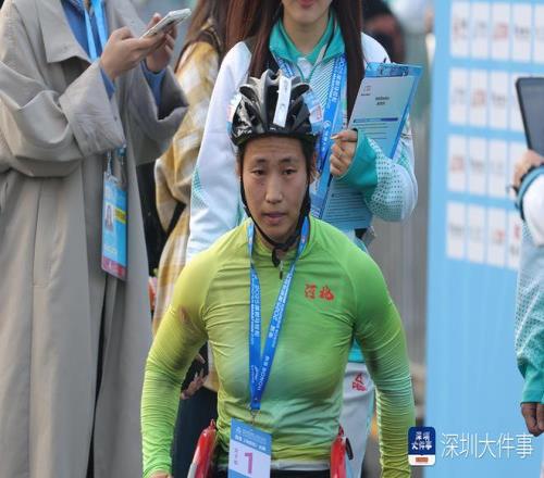 来自深圳的广东二队孙亮亮在肢体T46级别男子组比赛中荣获第四名。赛后他难掩激动:“我从没想过自己能拿到第四名。我跑马拉松只有两年时间。夏天三十多(摄氏)度的天气里,我一个月要跑500公里,一边上班一边坚持训练——清晨5点起床跑步,傍晚6点下班后继续跑。”他鼓励更多人参与其中:“希望所有人都能参与到跑步运动中来,只要坚持日积月累,你一定能够遇见更好的自己!”