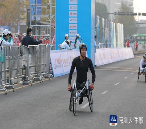 在率先发枪的全程马拉松T54级(竞速轮椅)比赛中,男子组决赛冲线阶段上演了惊心动魄的对决。来自辽宁的选手金华以1小时27分04秒的成绩率先冲过位于宝安区海滨广场的终点线,勇夺金牌。上海选手罗兴传以1小时27分05秒的成绩紧随其后,两人成绩仅差1秒,展现了顶尖选手间极致的速度与技巧。另一名上海选手代云强以1小时30分02秒获得季军。