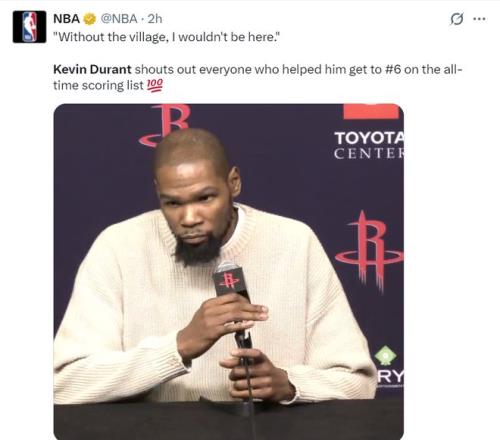 赛后杜兰特谈到自己的得分升至历史第六:这意义重大,德克是我敬仰的榜样,也是我曾对抗过的对手。我很荣幸能与这些伟大的球员并肩在得分榜单上。