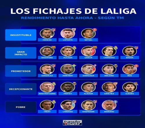 北京时间12月24日,德转对西甲今夏的几笔重要转会进行了评级,其中汉茨科、拉波尔特以及维特塞尔被评为无可替代,拉什福德、赫伊森等人被评为顶级,马斯坦托诺被评为令人失望,而亚历