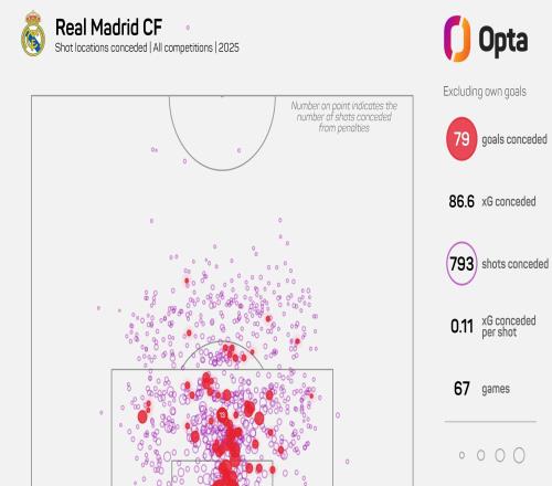 根据OPTA最新数据统计,皇家马德里在2025年各项赛事中已累计失球80个,在欧洲五大联赛所有球队中失球数排名第二,仅少于托特纳姆热刺(83球),与布雷斯特失球数持平。统计显示,皇马在20
