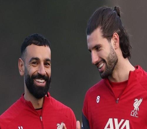 萨拉赫照常参加利物浦训练备战,和队友有说有笑